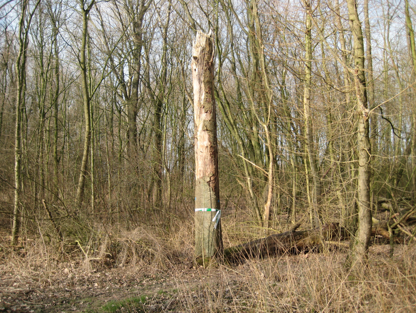 Wel blijven er, zoals in alle dorpsbossen, enkele hoge kale stammen van dode bomen staan, ten behoeve van de spechten (zie afbeelding).