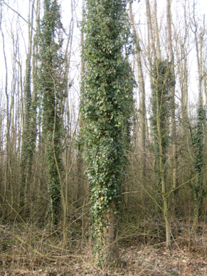 Veel bomen in het 'Onderdendamsterbos' zijn metershoog begroeid met klimop, wat mooie beelden oplevert en veel nestgelegenheid biedt aan vogels.